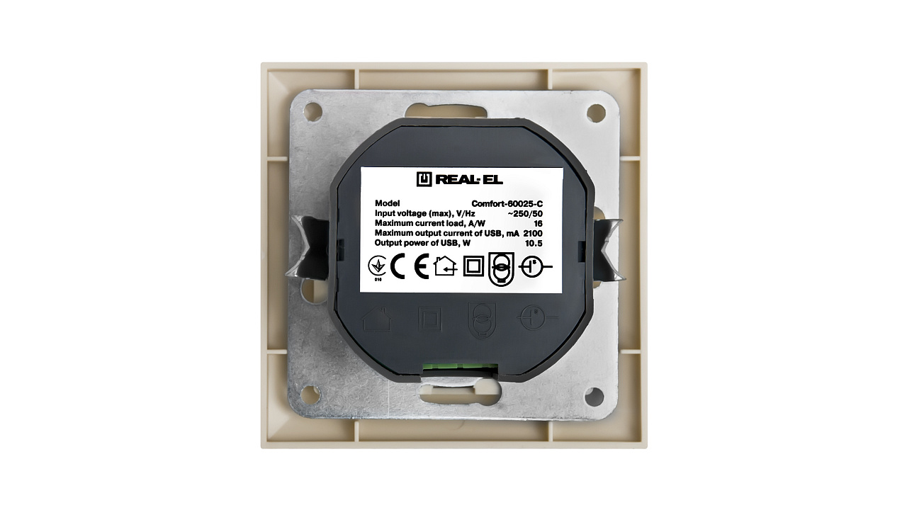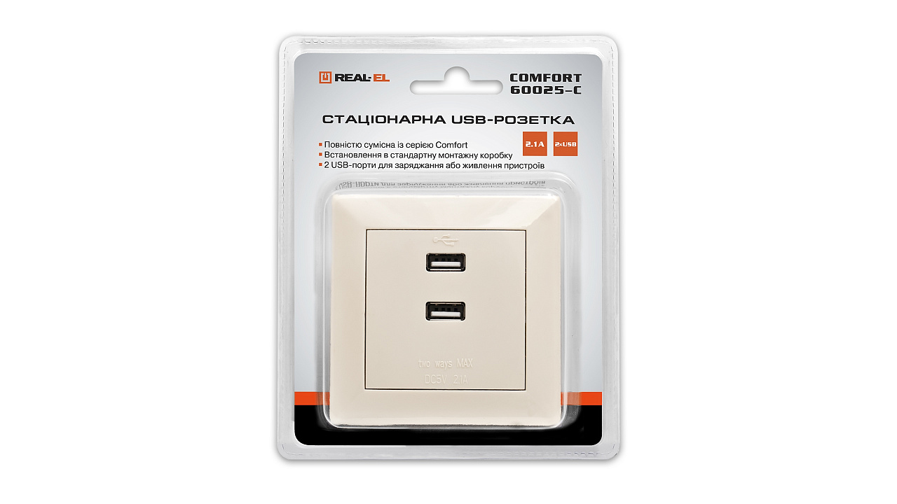 The stationary USB socket with built-in USB power block REAL-EL Comfort-60025-C is designed for simultaneous connection of 2 USB devices.