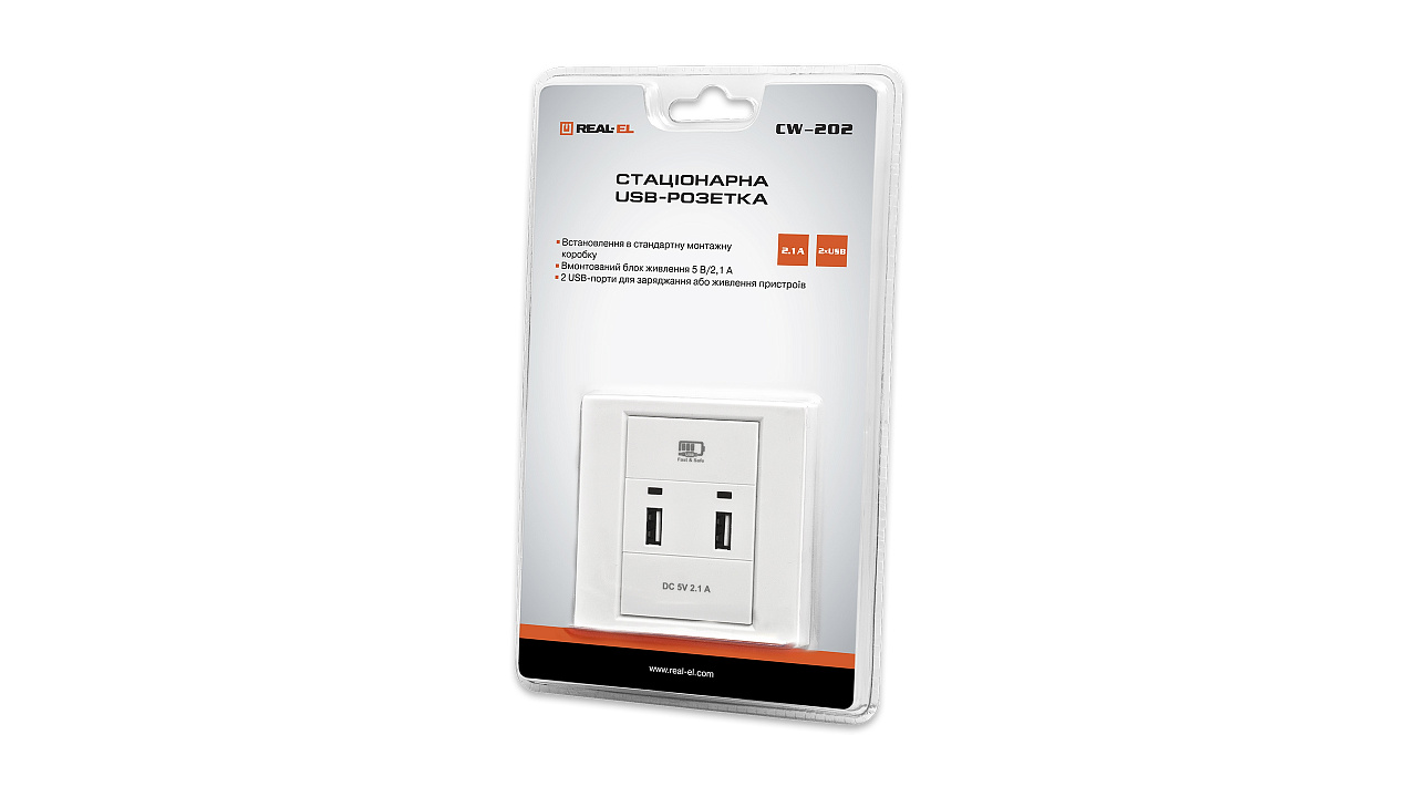 Stationary USB socket with built-in USB power block REAL-EL CW-202 is designed for simultaneous connection of 2 USB devices.