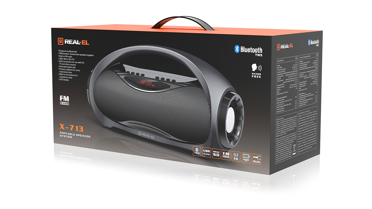 REAL-EL X-713 - kaasaskantav juhtmevaba Bluetooth kõlar, mis suudab pakkuda kaasaegset disaini ja kvaliteetset heli. Lai funktsionaalsus võimaldab muusikat kuulata, ühendades mobiilseadmeid, arvuteid, televiisoreid, sülearvuteid jne, nii AUX väljundi kui ka Bluetoothi kaudu. USB ja Micro SD pesad võimaldavad kuulata audiofaile mäluseadmetelt.