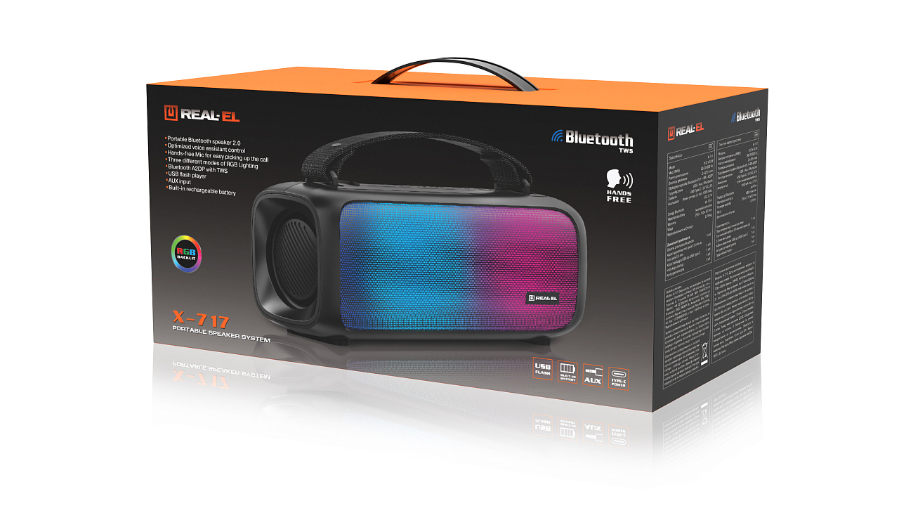 REAL-EL X-717 võimaldab Sul võtta oma lemmikmuusika kõikjale kaasa. RGB LED valgustus aitab hämarates oludes luua paremat peomeeleolu.