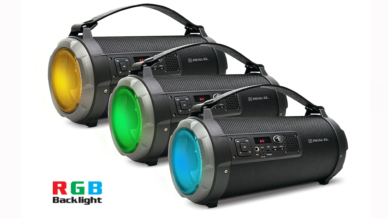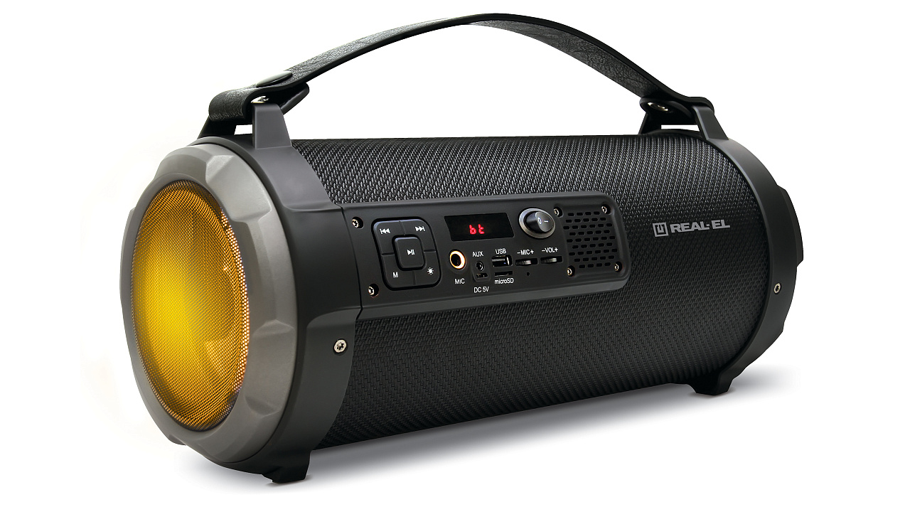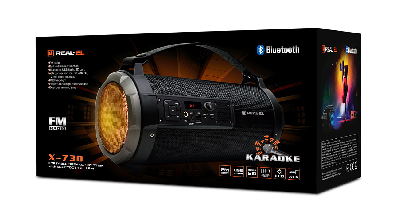 REAL-EL X-730 kaasaskantav bluetooth on kompaktne kaasaskantav kõlar, mis pakub juhtmevaba ühendust mistahes Bluetooth seadmega. Tänu laetavale akule võib kõlar mängida kuni 12 tundi järjest. Kaasaskantav kõlari võimaldab nautida heli igas ulatuses. Aseta lihtsalt seade toa keskele ja igaüks saab nautida erinevaid muusikapalasid. kindel konstruktsioon aitavad sul meeleolu luua kõikjal. Toetab: bluetooth (10m), USB-mälupulk, SD-kaart, AUX (3,5mm), FM-raadio, RGB taustvalgus, karaoke funktsioon.