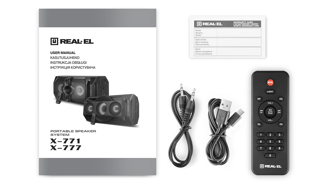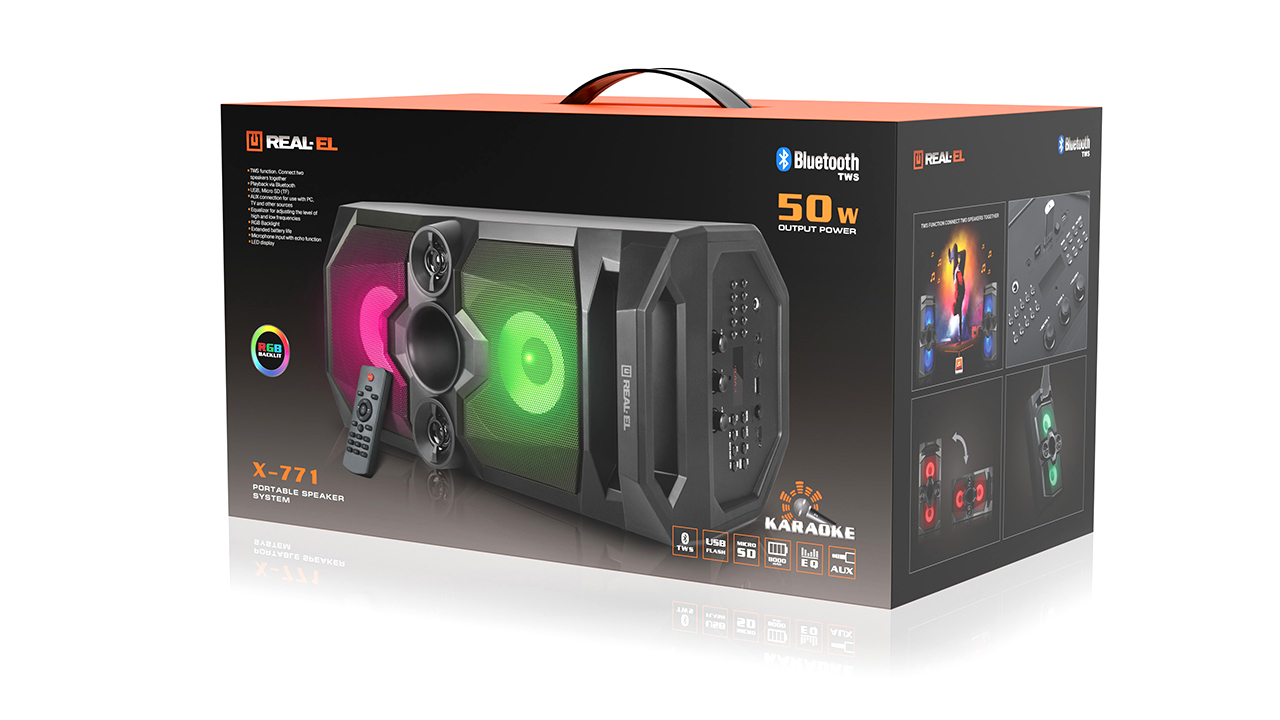 REAL-EL X-771 multimeedia kaasaskantav akustiline süsteem omab kaasaegset disaini ja kvaliteetset heli. Selle lai funktsionaalsus võimaldab muusikat kuulata, ühendades mobiilseadme, arvuti, televiisori, sülearvuti jne nii AUX väljundi kui ka Bluetoothi kaudu. USB ja Micro SD kaardi pesad võimaldavad kuulata audiofaile flash-mäluseadmetelt.