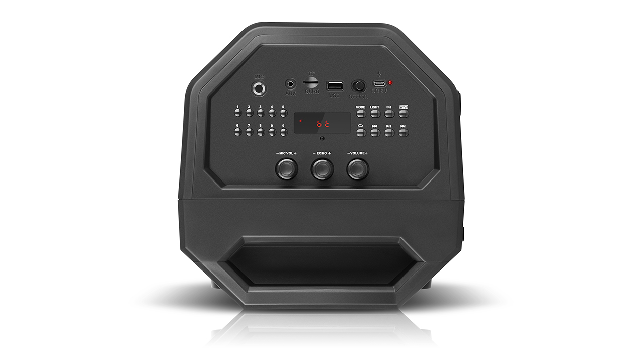 Taasesitus USB-mäluseadmetelt pic Mitmevärviline taustavalgustus pic Sisseehitatud 8000 mAh aku pic Taasesitus Mikro SD-kaartidelt pic AUX liini sisend pic Sisseehitatud ekvalaiser pic Võimaldab kahel eraldi Bluetooth-seadmel töötada stereorežiimis pic Kajafunktsiooniga mikrofoni sisend pic Väljundvõimsus 50 W pic Vedelkristallkuvar pic