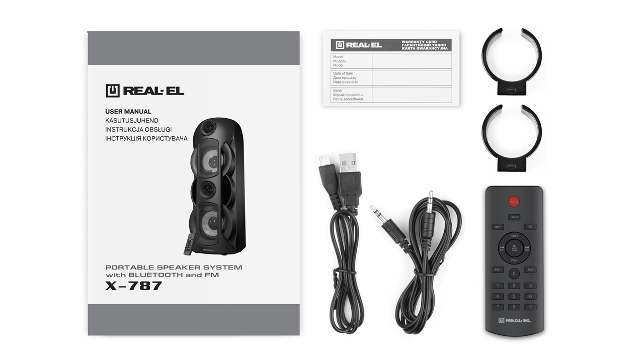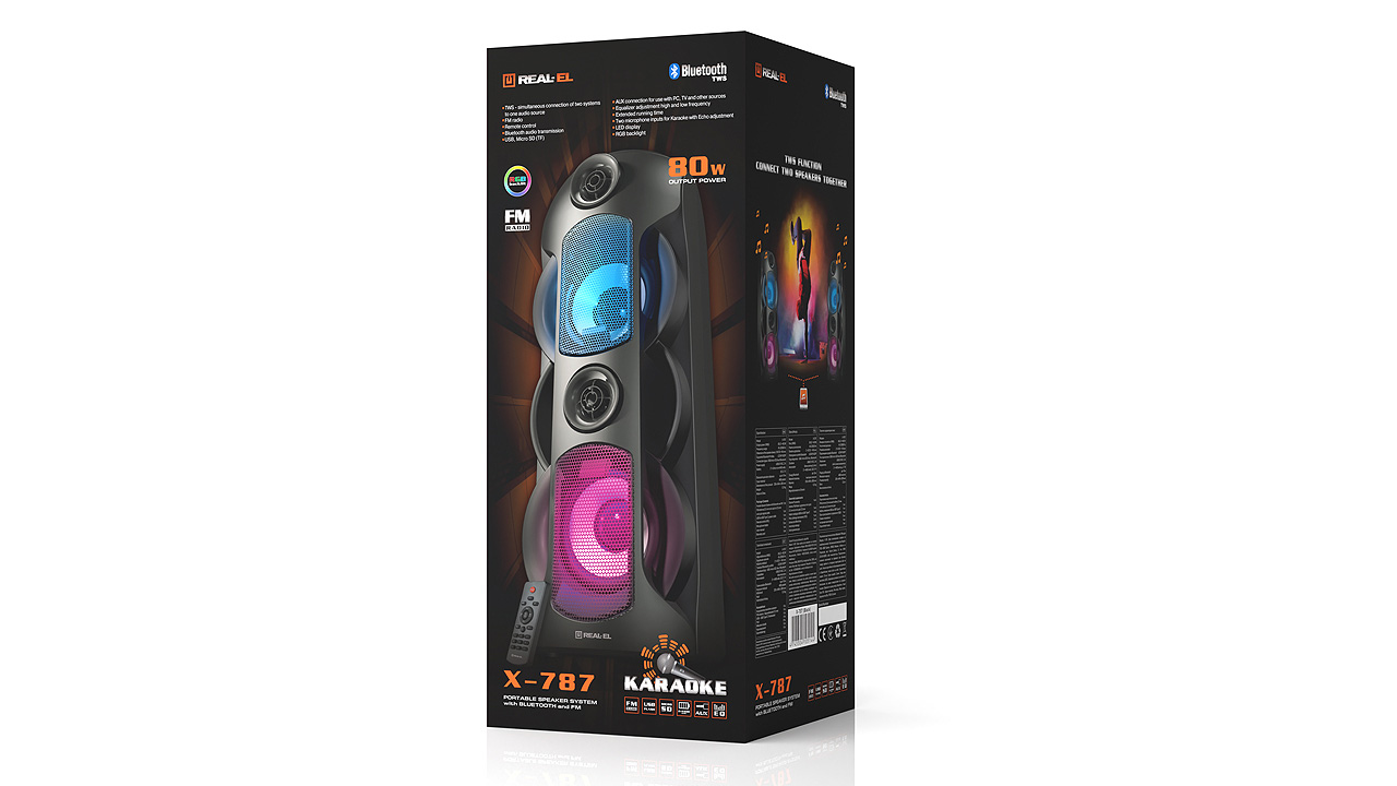 REAL-EL X-787 multimeedia kaasaskantav akustiline süsteem omab kaasaegset disaini RGB-valgustuse ja kvaliteetse võimsa 80-vatise heliga. Selle lai funktsionaalsus võimaldab muusikat kuulata, ühendades mobiilseadme, arvuti, televiisori, sülearvuti jne nii AUX väljundi kui ka Bluetoothi kaudu. USB ja Micro SD kaardi pesad võimaldavad kuulata audiofaile flash-mäluseadmetelt. REAL-EL X-787 on suurepärane kaaslane vabas õhus puhkamiseks, kaks võimsat 4400 mAh liitium-ioonakut tagavad muusika pikaks ajaks. KARAOKE funktsioon üllatab meeldivalt lauluhuvilisi, kuna see mudel võimaldab ühendada korraga kaks mikrofoni koos kajafunktsiooniga. TWS funktsioon kahekordistab võimsust - võimaldab ühendada korraga kaks süsteemi ühe signaallähte külge Bluetoothi kaudu. Lõpuks, mugavuse huvides on kaasas kaugjuhtimispult.