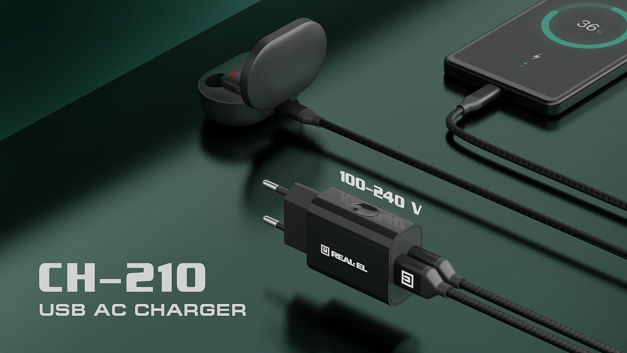 Võrgu USB-laadimisseade REAL-EL CH-210 Blackon mõeldud kaasaskantavate seadmete (mobiiltelefonid, nutitelefonid, MP3-mängijad, PDA-d, tahvelarvutid ja muud digitaalsed seadmed) akude laadimiseks ning kaasaskantava akustika toiteks koduelektrivõrgust.