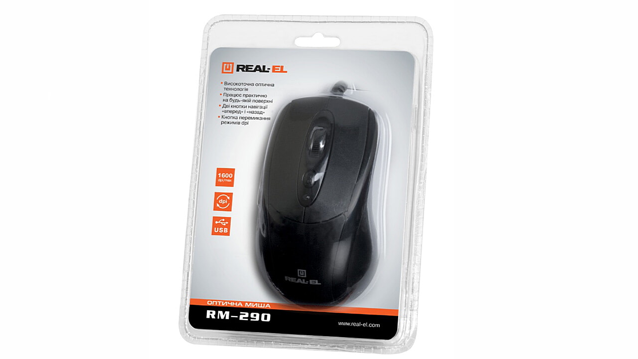Kõrgtäpne optiline tehnoloogia võimaldab REAL-EL RM-290 manipulaatoril töötada praktiliselt igal pinnal. Omadused: 5 + 1 nuppu, usaldusväärne ergonoomiline konstruktsioon, kererull, 2 navigeerimisnuppu "edasi" ja "tagasi", dpi režiimi lüliti nupp, USB-liides, loomulik seadme kuju mugav käele.