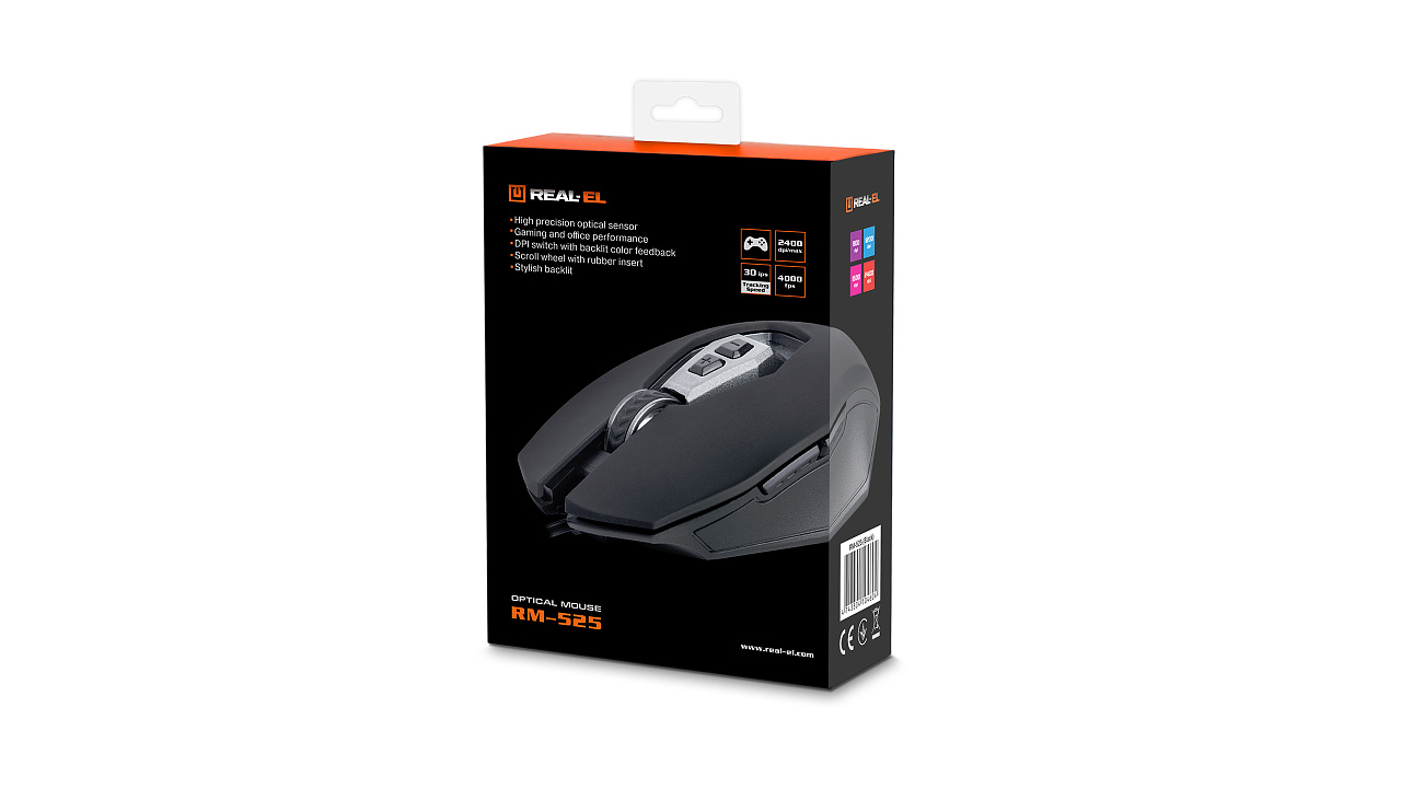 Kõrgtäpne optiline tehnoloogia võimaldab mänguarvutiga hiirel REAL-EL RM-525 töötada praktiliselt igal pinnal. Omadused: kõrge töökiirus, 6 + 1 nuppu, kererull, 2 navigeerimisnuppu "edasi" ja "tagasi", DPI resolutsiooni lüliti, Soft Touch korpuse katmine, sisseehitatud valgustus.