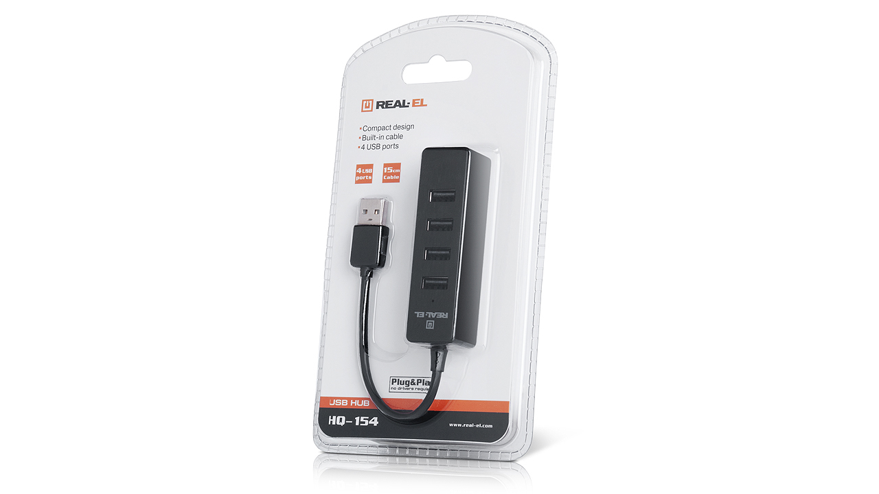 REAL-EL HQ-154 USB 2.0 HUB on mõeldud USB-portide arvu pikendamiseks ja suurendamiseks võimalusega kasutada neid kõiki korraga. Sedasi võib seda kasutada kõigi seadmetega, mis toetavad ühendust USB-A porti kaudu.