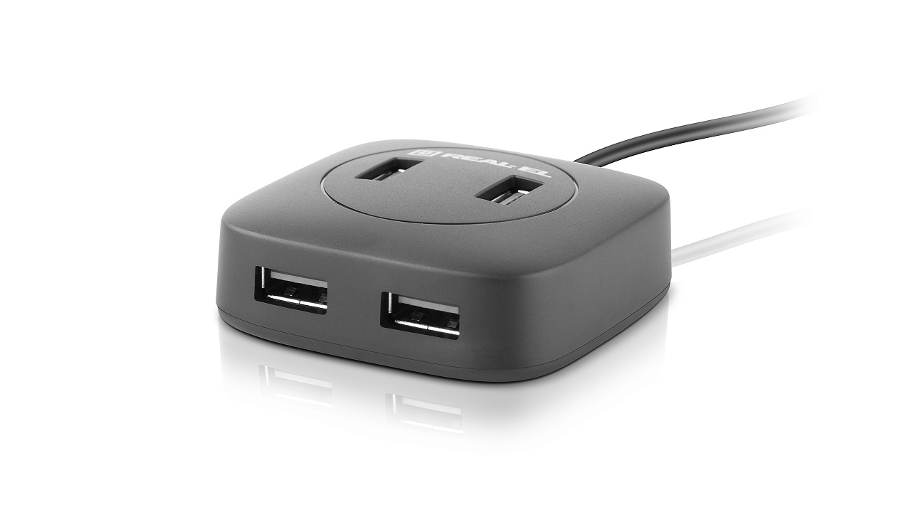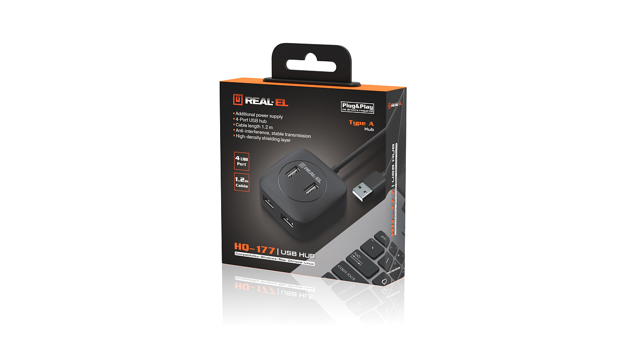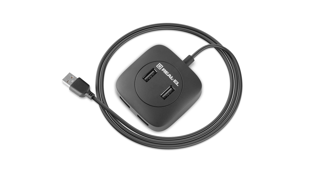 REAL-EL HQ-177 USB 2.0 HUB mõeldud USB-portide arvu pikendamiseks ja suurendamiseks koos võima- lusega kasutada kõiki korraga. Saab kasutada kõigi USB-A-ühenduvusega seadmetega.