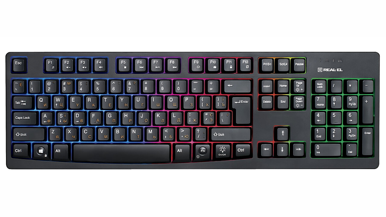 Taustvalgustusega multimeedia klaviatuuri REAL-EL Comfort 7000 Backlit eripäraks on klahvide mitmevärviline taustvalgustus, spetsiaalse valgusindikaatoriga funktsioon Winlock, 19 omavahel mittekonfliktset klahvi, võimalus kasutada mängudes, klahvide pehme mugav käik.