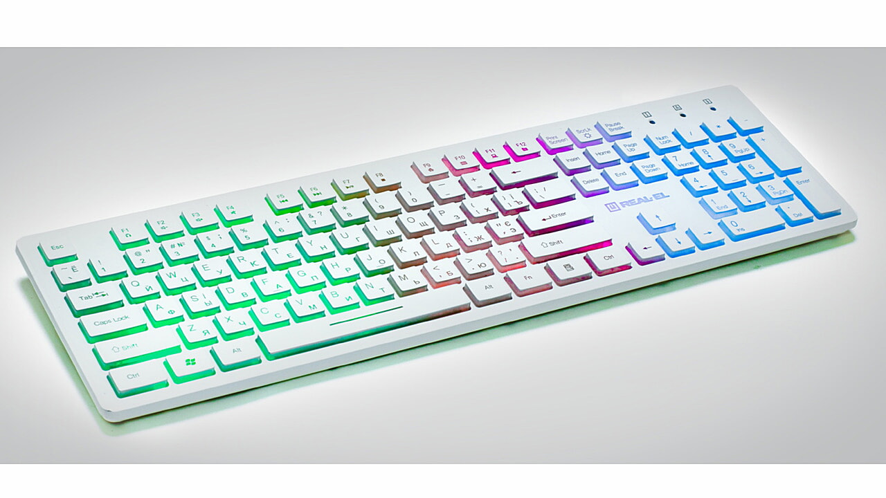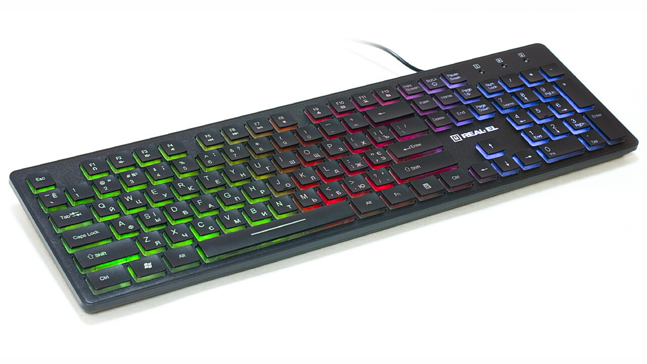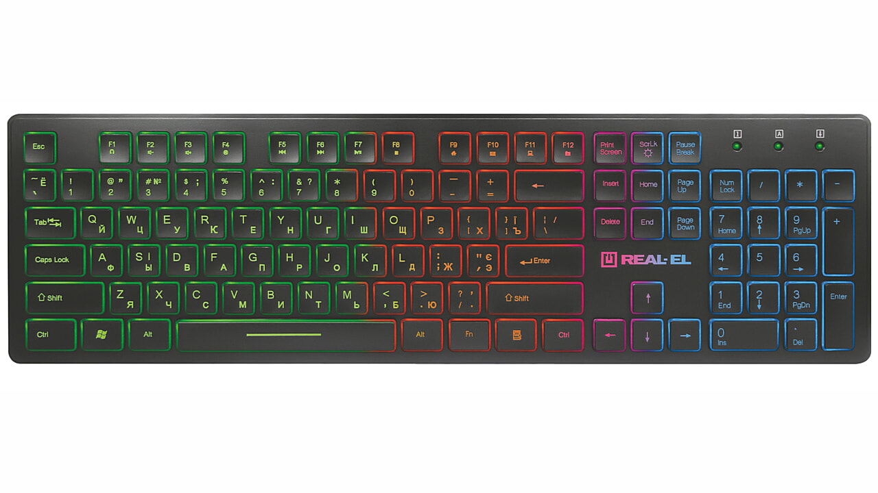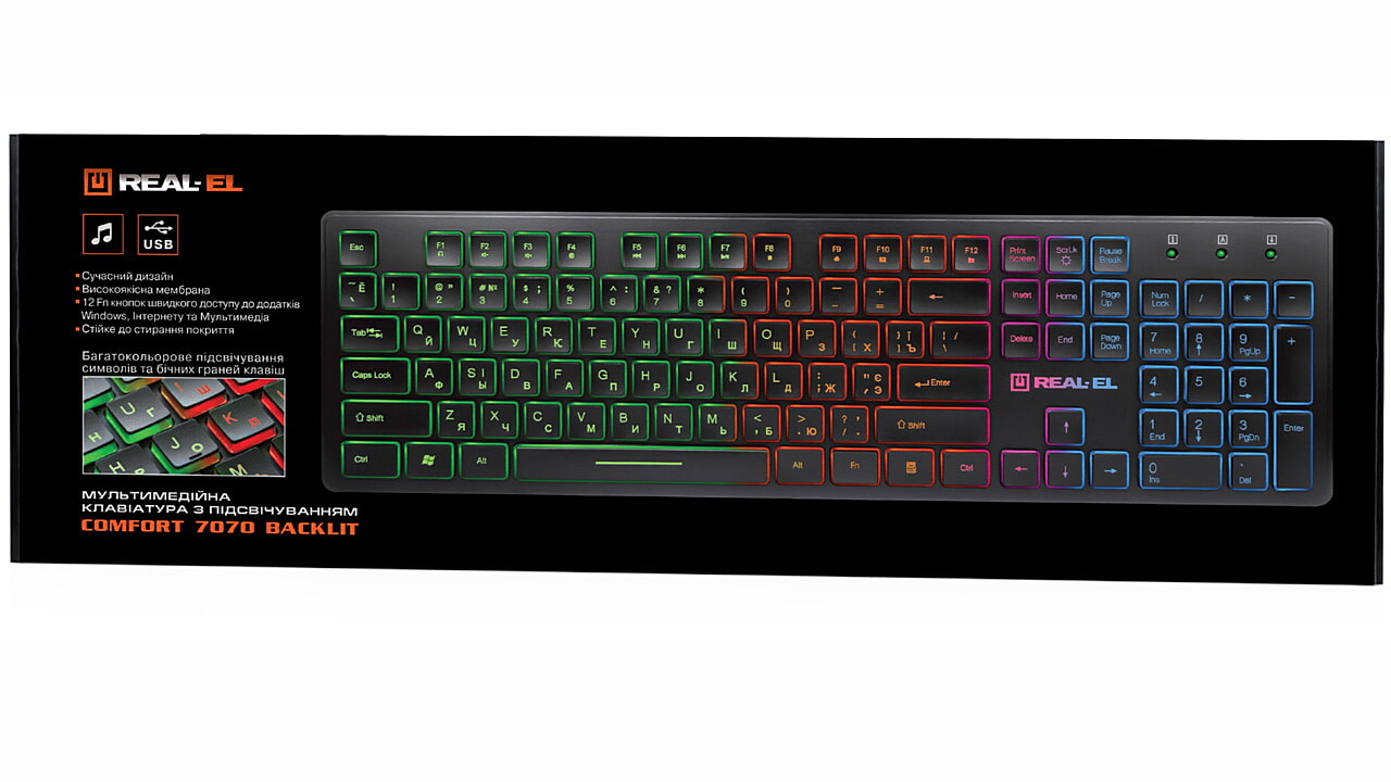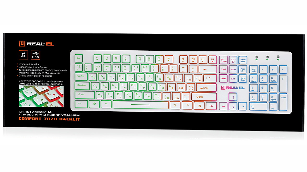 REAL-EL Comfort 7070 Backlit multimeediumklaviatuuri eripäraks on kaasaegne disain, sümbolite ja klahvide külgede mitmevärviline taustavalgustus, kvaliteetne membraan, 12 Fn kiirklahvi Windowsi, Interneti ja multimeediumi jaoks ning kulumiskindel kattekiht.