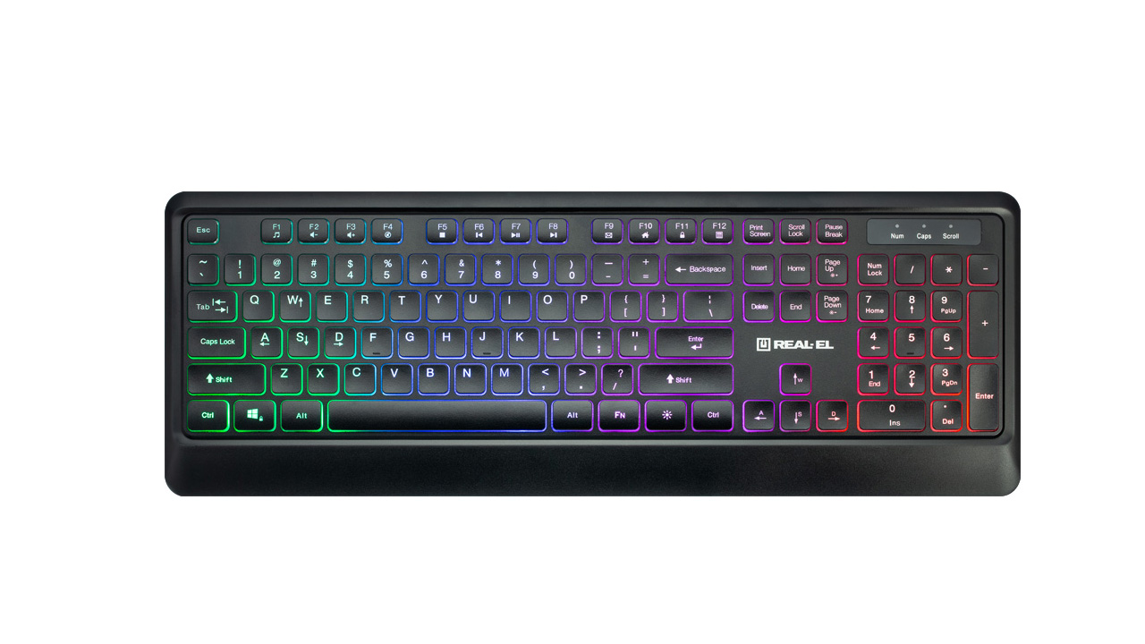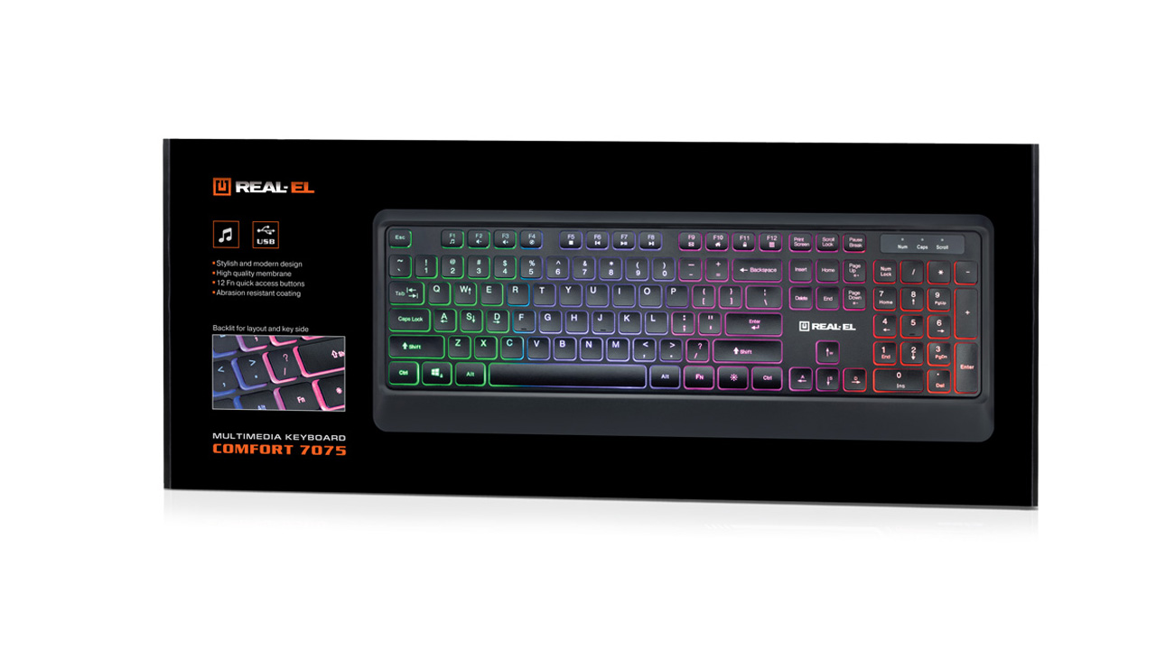 Taustvalgustusega multimeedia klaviatuuri REAL-EL Comfort 7075 EN eripäraks on klahvide mitmevärviline taustvalgustus, kulumiskindlad kate, võimalus kasutada mängudes, klahvide pehme mugav käik.