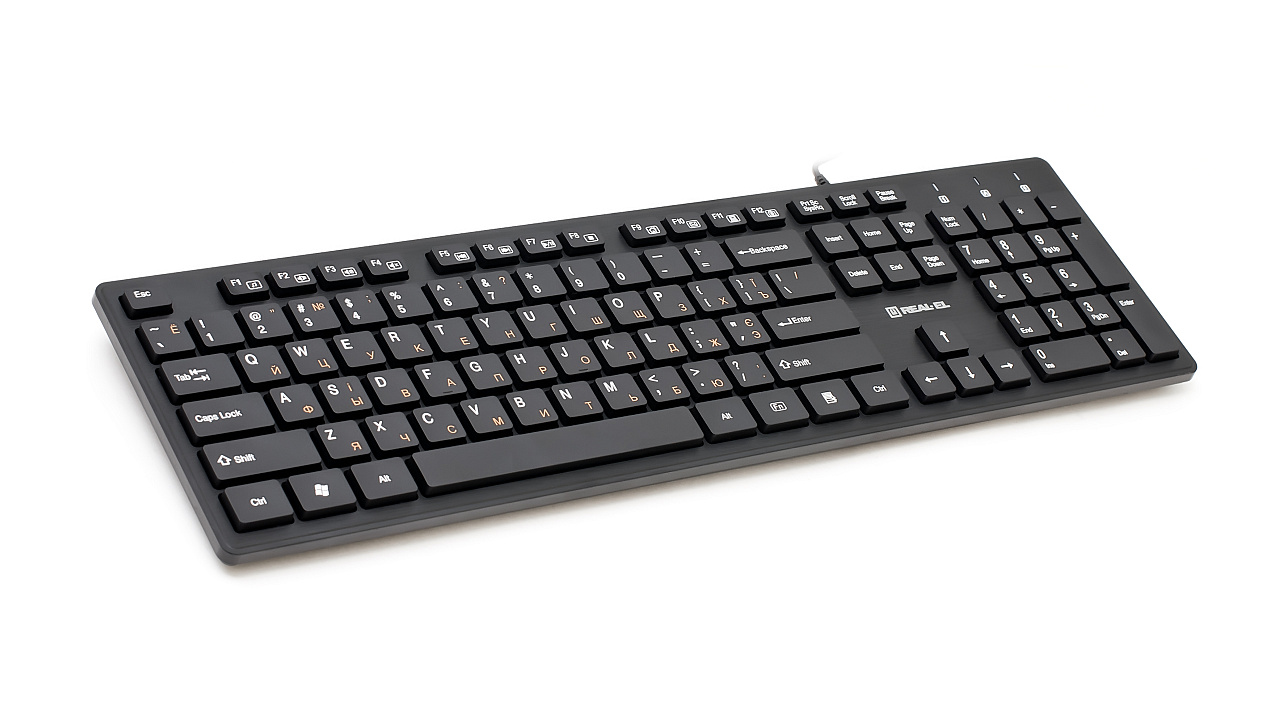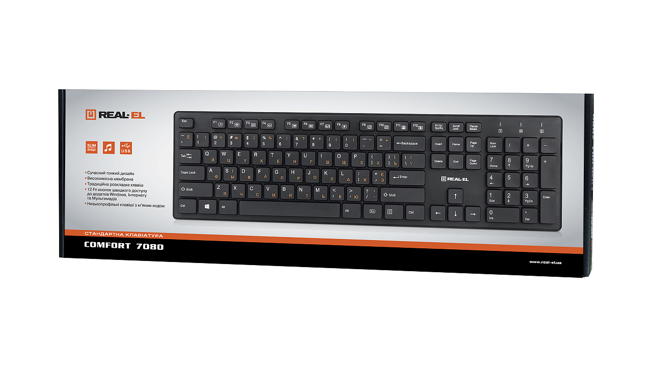 Kaasaegne õhuke kompaktne disain, traditsiooniline klaviatuuri paigutus, brauseri kiirklahv, USB-liides, madalad profiiliga klahvid pehme käiguga - REAL-EL Comfort 7080 klaviatuuri omadused.