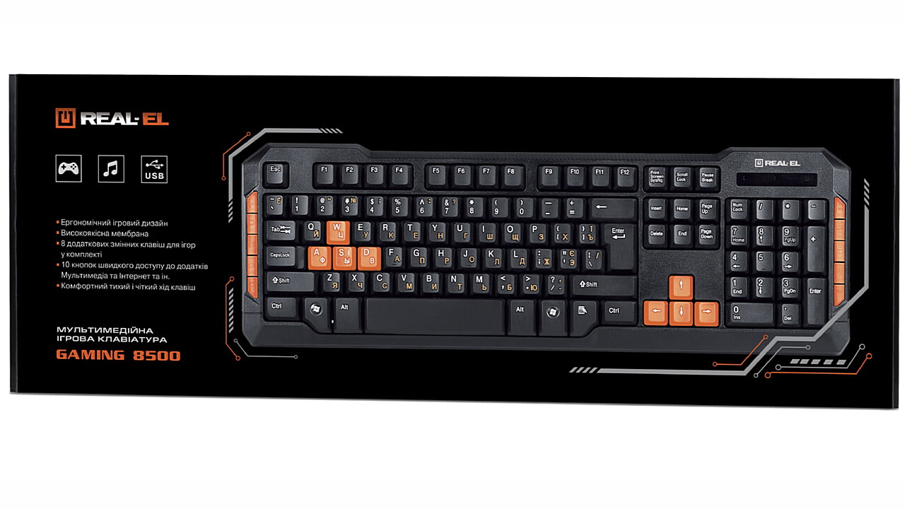 Mänguri klaviatuur REAL-EL Gaming 8500 on varustatud USB-liidesega. Selle paigaldamine toimub automaatselt pärast ühendamist personaalarvuti USB-pessa. Kõrgkvaliteetne membraan ja klahvide vaikne käik tagavad klahvide kerge ja pehme vajutuse. Mudel on täiendavalt varustatud 10 kiirjuurdepääsu klahviga Windowsi, Interneti, Multimeedia jne rakendustele ja 8 täiendava asendusklahviga mängimiseks (komplektis).