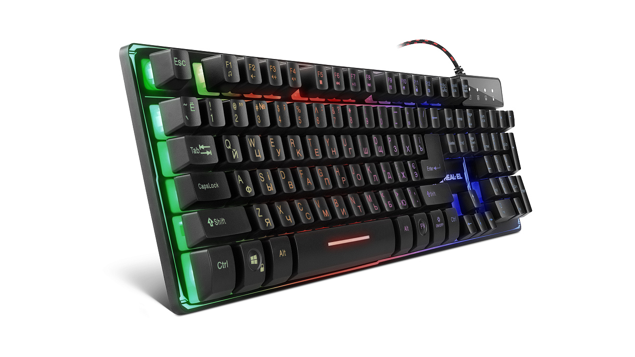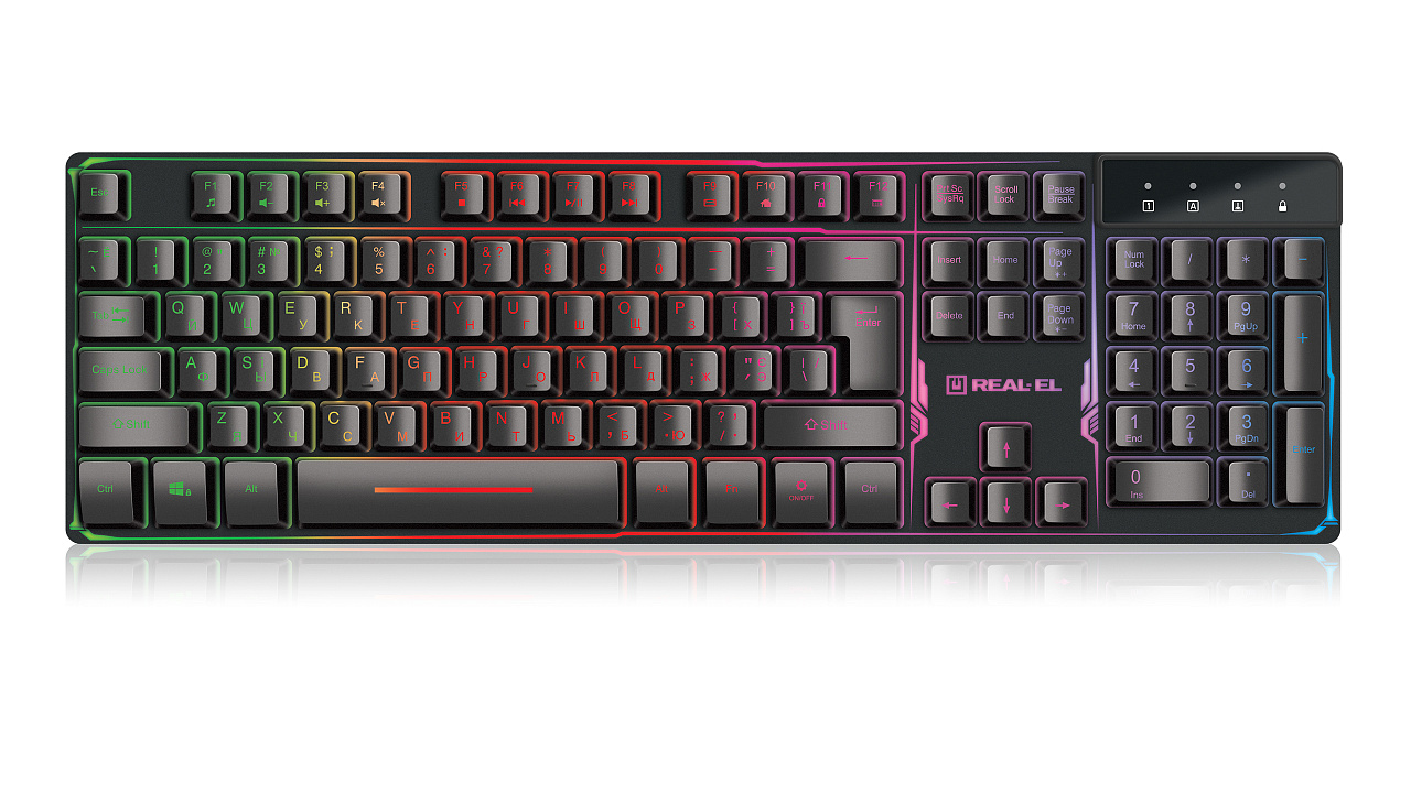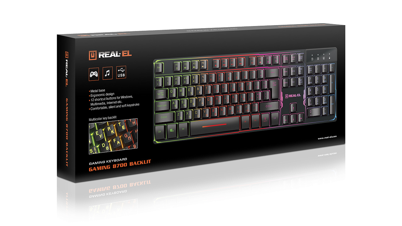 REAL-EL GAMING 8700 Backlit mänguklaviatuuri eripärad on: ergonoomiline mängudisain, metallist alus, vähendatud müra töötamisel, vaikne ja täpne klahvivajutus, 12 Fn kiirjuurdepääsuklahvi Windowsile, Internetile ja multimeediale, kangasümbrisega kaabel. Mitmevärviline klaviatuuri taustavalgustus erinevate heledustasemetega, saadaval on "hingamisrežiim".