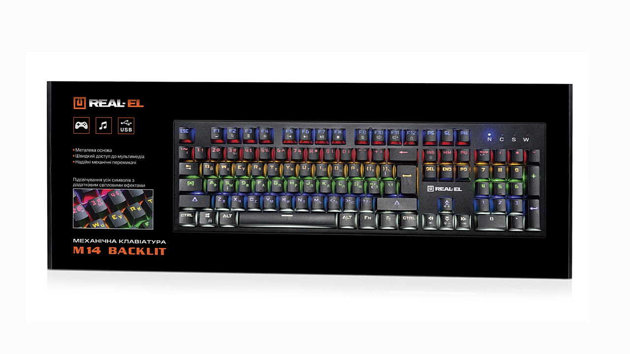 Klaviatuuri REAL-EL M14 Backlit eripäraks metallist alus, NKRO, programmeeritavad tagantvalgustuse režiimid, full taustavalgustusega ekstra valguse mõju, usaldusväärne mehaaniliste lülitite, 12 Fn funktsiooniklahvi kiireks juurdepääsuks Windowsi, Internetti, Multimeedia jne.