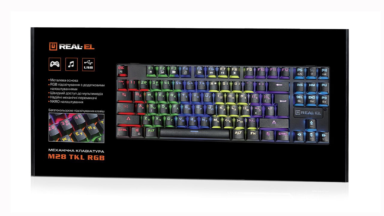 Klaviatuuri REAL-EL M28 TKL RGB eripäraks usaldusväärne mehaaniliste lülitite, kompaktne disainiga metallist alus, NKRO seaded, 8 Fn funktsiooniklahvi kiireks juurdepääsuks Windowsi, Internetti, multimeedia jne.