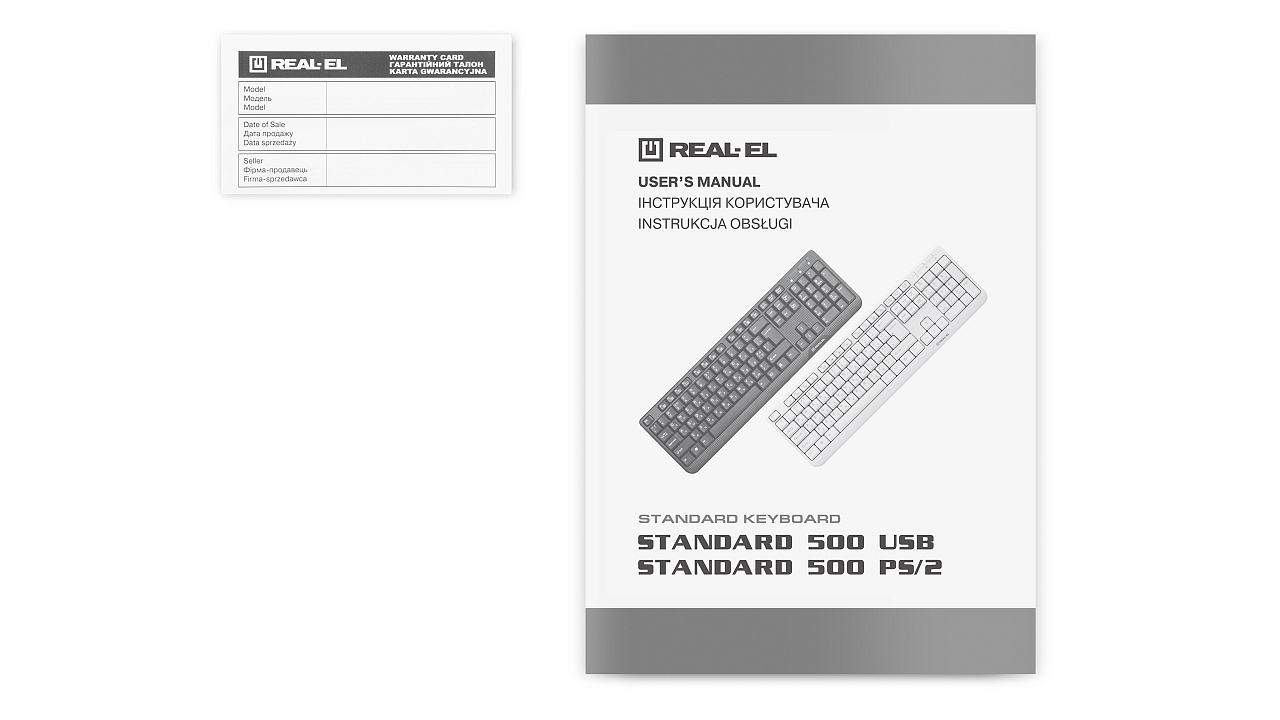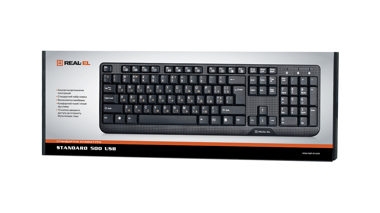 REAL-EL Standard 500 klaviatuur on varustatud USB- või PS/2-liidesega. Selle paigaldamine toimub automaatselt pärast ühendamist arvuti USB- või PS/2-porti. Kõrgekvaliteetne membraan ja vaikne klahvide liikumine tagavad nuppude kerge ja pehme vajutamise. Mugavuse huvides on mudel varustatud kiirklahviga kalkulaatori juurdepääsuks.