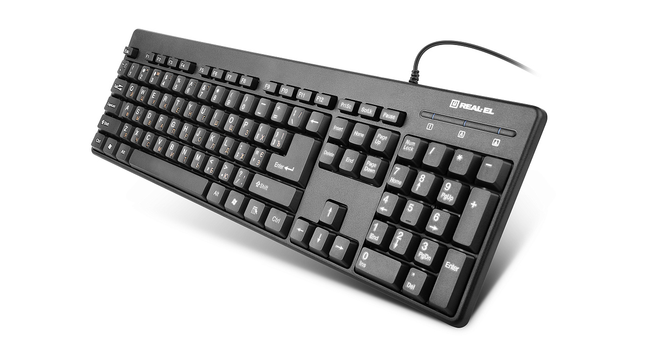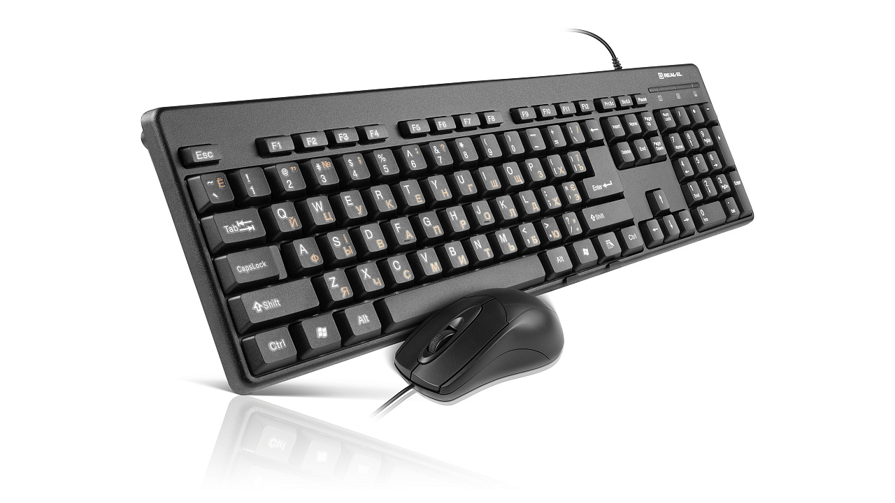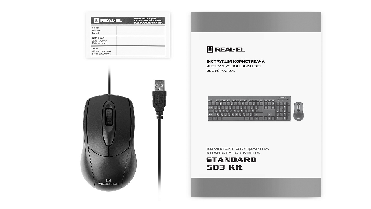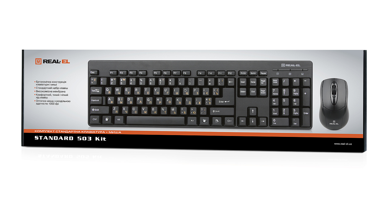 Ergonoomiline disain, standardne klahvipaigutus, kõrgekvaliteetne membraan, mugav, vaikne ja täpne klahvide kasutus, USB-liides - omadused komplekti REAL-EL Standard 503 Kit klaviatuur + hiir.