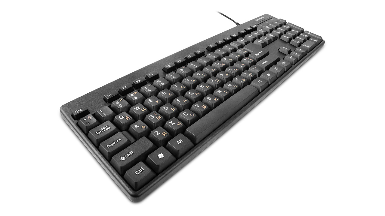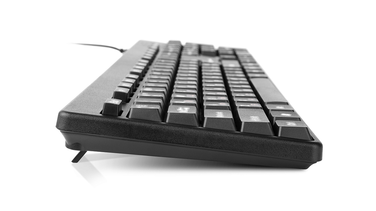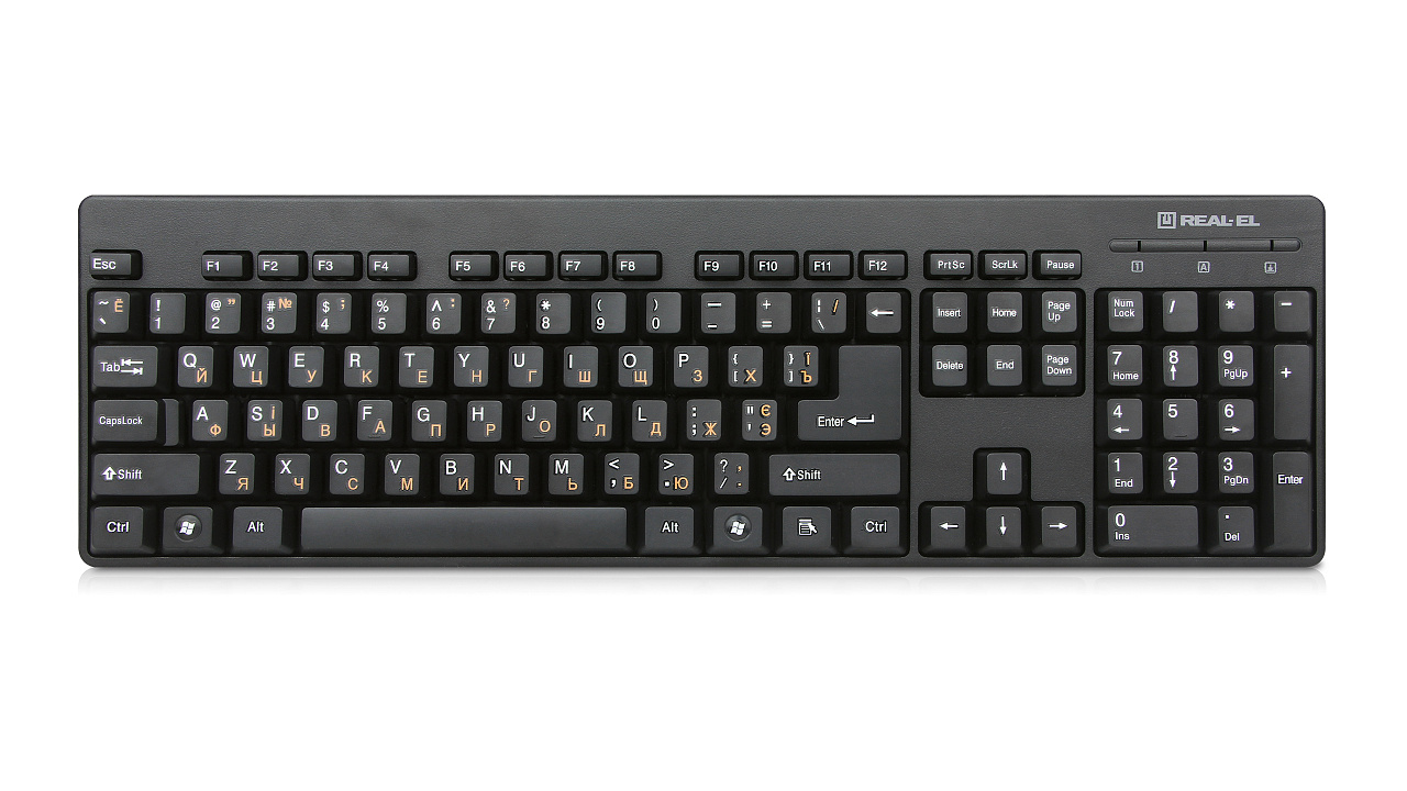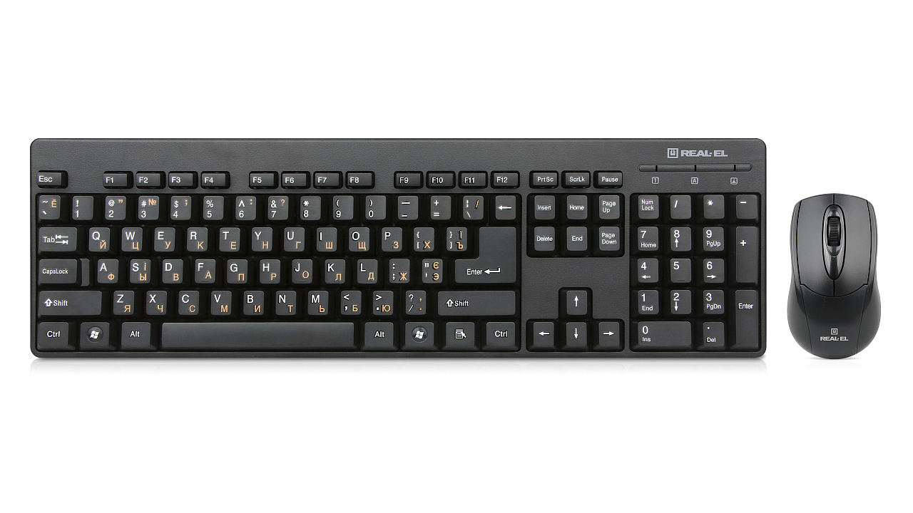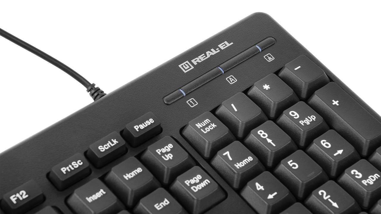 Ergonoomiline disain, standardne klahvipaigutus, kõrgekvaliteetne membraan, mugav, vaikne ja täpne klahvide kasutus, USB-liides - omadused komplekti REAL-EL Standard 503 Kit klaviatuur + hiir.