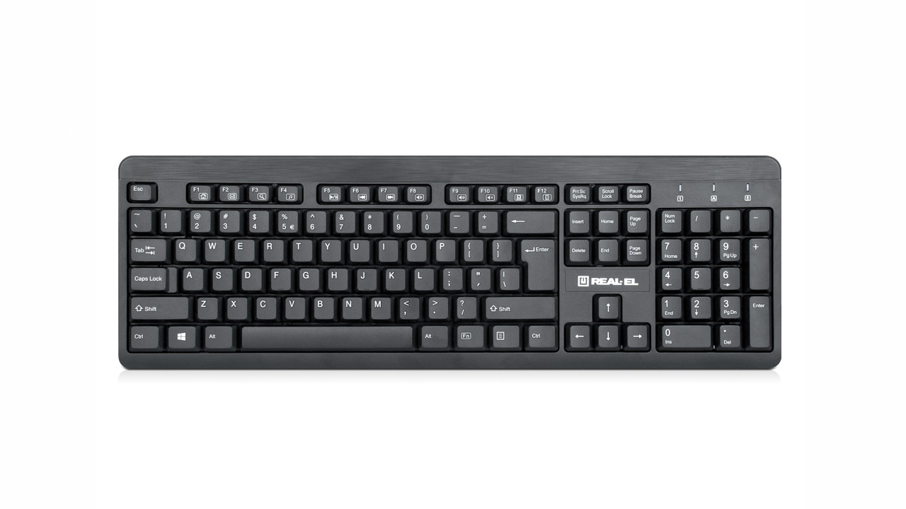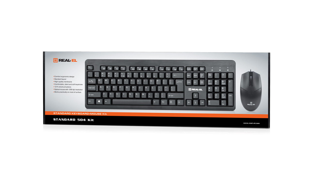Klaviatuuri ja hiire ergonoomiline konstruktsioon, klaviatuuri kõrgkvaliteetne membraan, USB liides, optiline hiir eraldusvõimega 1200 dpi, klahvide mugav, standardne klaviatuur + hiir REAL-EL Standard 504 Kit EN.
