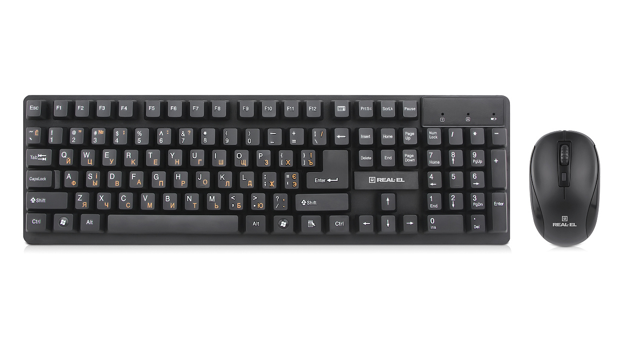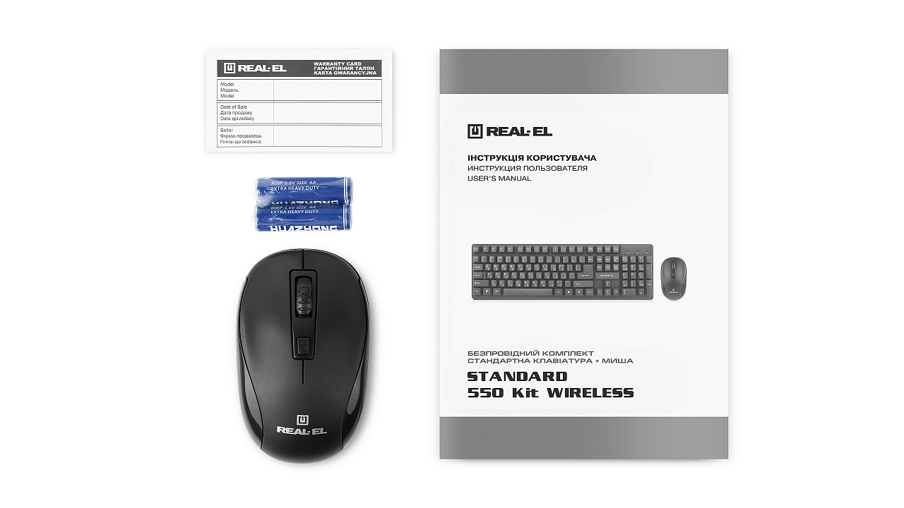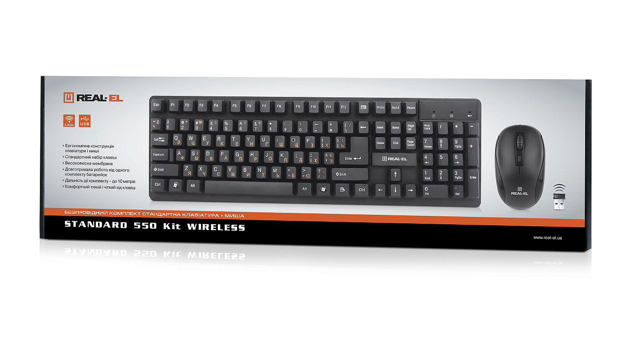 Klaviatuuri ja hiire ergonoomiline disain, standardne klahvipaigutus, USB, automaatne ühendus, mis ei nõua vastuvõtja ühendamist manipulaatoriga, kuni 10 m kaugusel, vähendatud müra töötamisel, pikaajaline töö ühe komplekti patareidega - traadita komplekti omadused standardne klaviatuur + hiir REAL-EL Standard 550 Kit Wireless.