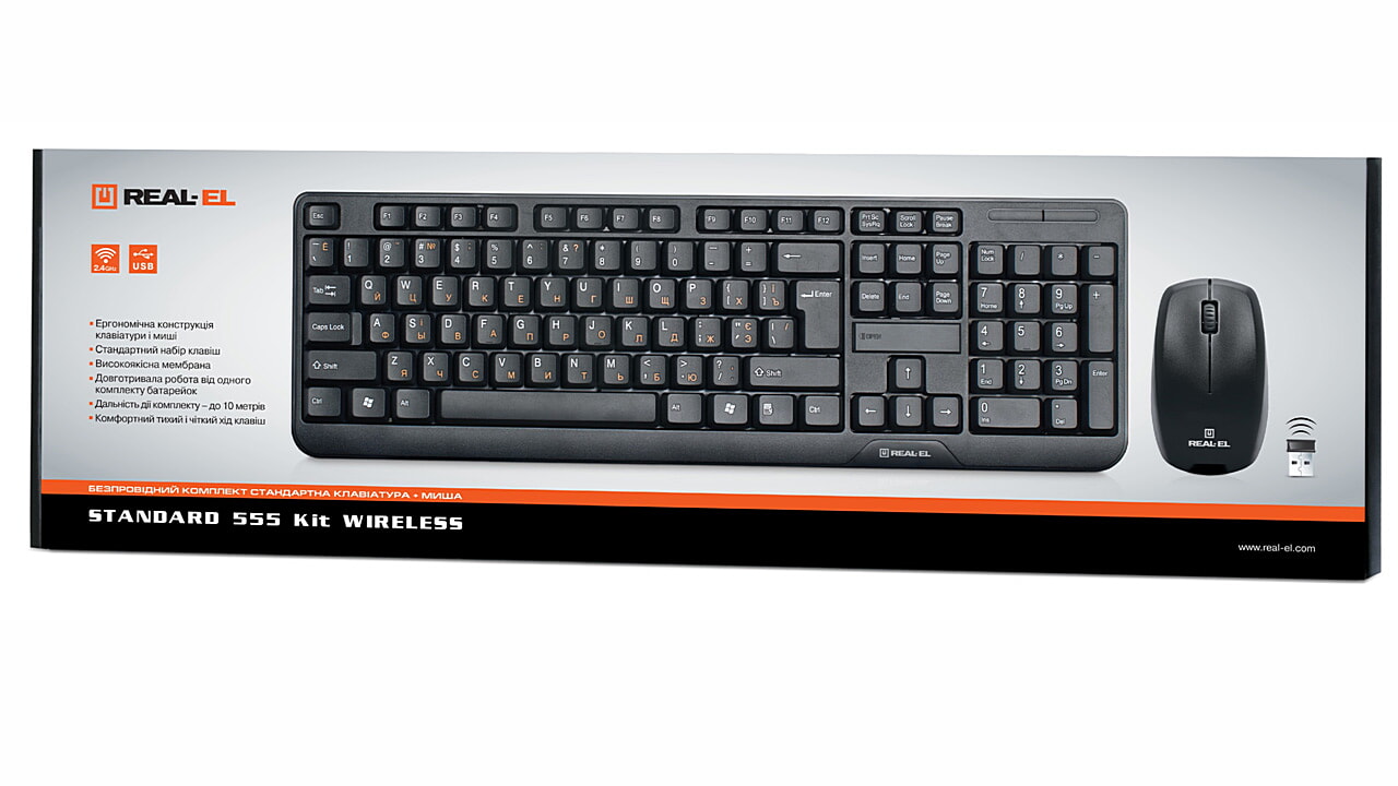Klaviatuuri ja hiire ergonoomiline konstruktsioon, klahvide standardne komplekt, USB, automaatne ühendamine, mis ei nõua vastuvõtja häälestamist manipulaatoriga, komplekti toimekaugus – kuni 10 meetrit, optiline hiir eraldusvõimega 1000 dpi, kõrgkvaliteetne membraan, vähendatud töömüra, pikaajaline töö ühe patareide komplektiga – juhtmevaba komplekti eriomadused: standardne klaviatuur + hiir REAL-EL Standard 555 Kit Wireless.