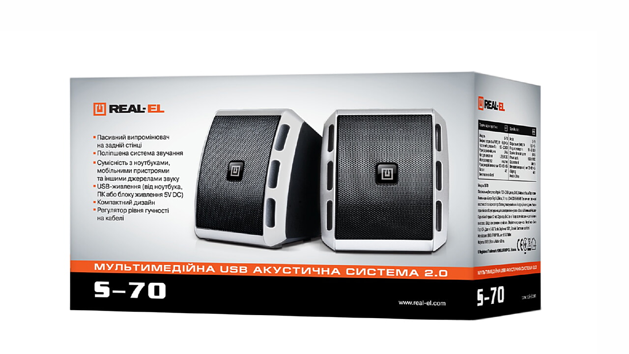 Multimeedia USB akustiline süsteem REAL-EL S-70 – teie arvuti (sülearvuti) helisaate kerge ja kättesaadav lahendus. REAL-EL S-70 on ühtiv mobiilsete seadmetega ja muude heli allikatega.