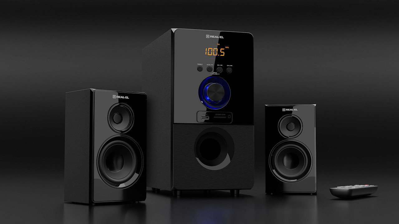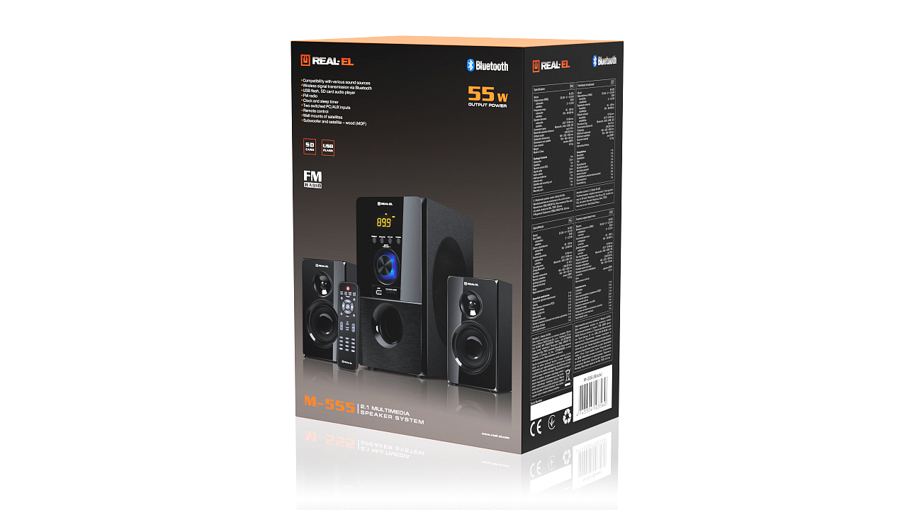 Akustiline süsteem 2.1 REAL-EL M-555 on võimas, universaalne ja mugav 2.1 akustiline süsteem, mis on loodud muusika esitamiseks ja suudab pakkuda muljetavaldavat helisaadet filmide vaatamisel, mängimisel, kodupidudel jne. Sügavate madalsageduste austajatele on see varustatud võimsa subwooferiga. Tänu ühilduvusele erinevate heliallikatega saate nautida oma lemmikmuusikat mis tahes seadmest. Juhtmevaba signaali edastamine Bluetoothi kaudu, USB flash ja SD-kaardilt helifailide mängija, sisseehitatud FM-raadio, kell ja väljalülitustaimer täiendavad süsteemi funktsionaalsust. See on varustatud ka kahe lülitatava sisendiga PC/AUX, kaugjuhtimispuldiga ja satelliitide seinakinnituse võimalusega. Elegantne puidust (MDF) korpus subwooferile ja satelliitidele lisab esteetikat ja tagab puhta ja sügava heli.