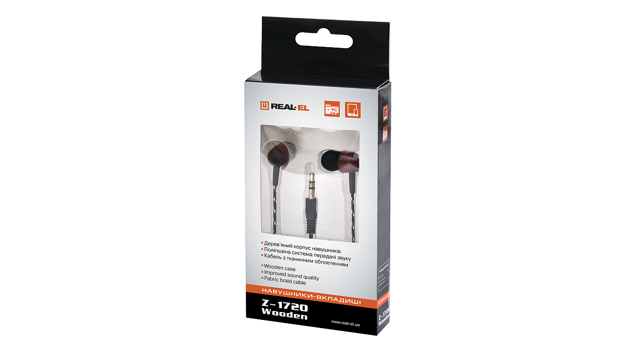 In-ear kõrvaklapid REAL-EL Z-1720 Wooden on mõeldud töötama koos PC helikaartidega ja teiste nendega ühilduvate süsteemidega (portatiivsete mängijate, arvuti mängukonsoolide jne).