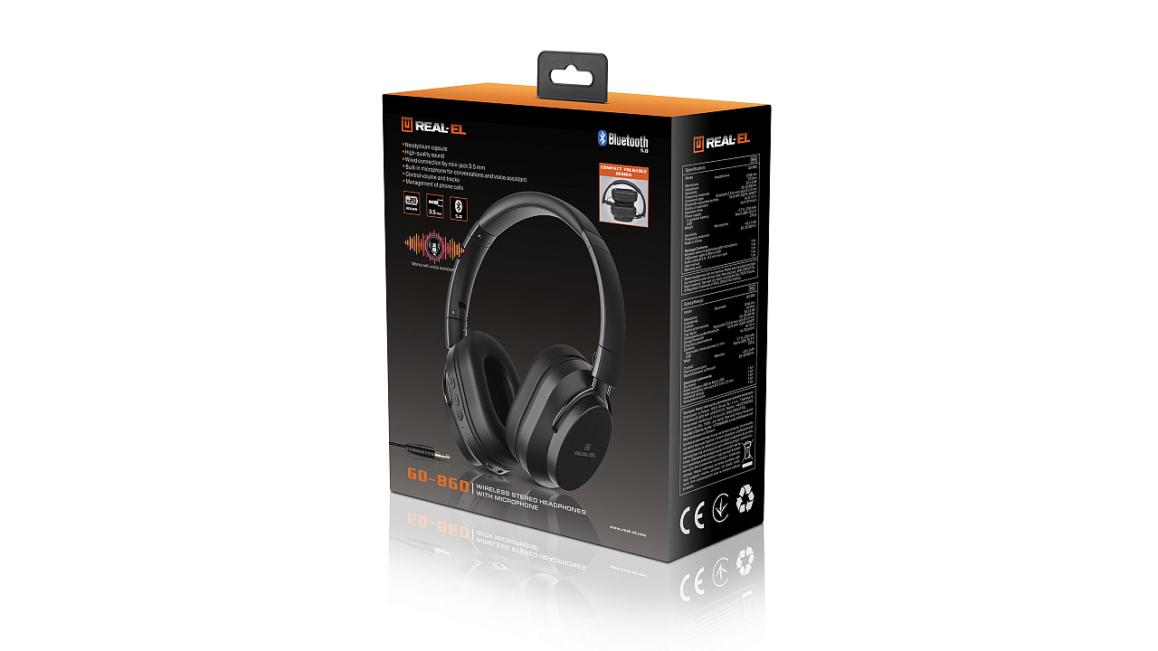 Juhtmevabad kõrvaklapid koos mikrofoniga REAL-EL GD-860 eristuvad kompaktsuse poolest (tänu kokkuklapitavale tugevale konstruktsioonile), mugav istuvus suuruse regulaatoriga ja väike kaal. See mudel on ühilduv erinevate seadmetega Bluetooth 5.0 protokolli abil (toetab ka eelmisi versioone). Sisseehitatud aku võimaldab autonoomset tööaega kuni 20 tundi, ja kui soovite tööd jätkata, sisaldab komplekt USB-toitekaablit ja kaablit juhtmega ühendamiseks.