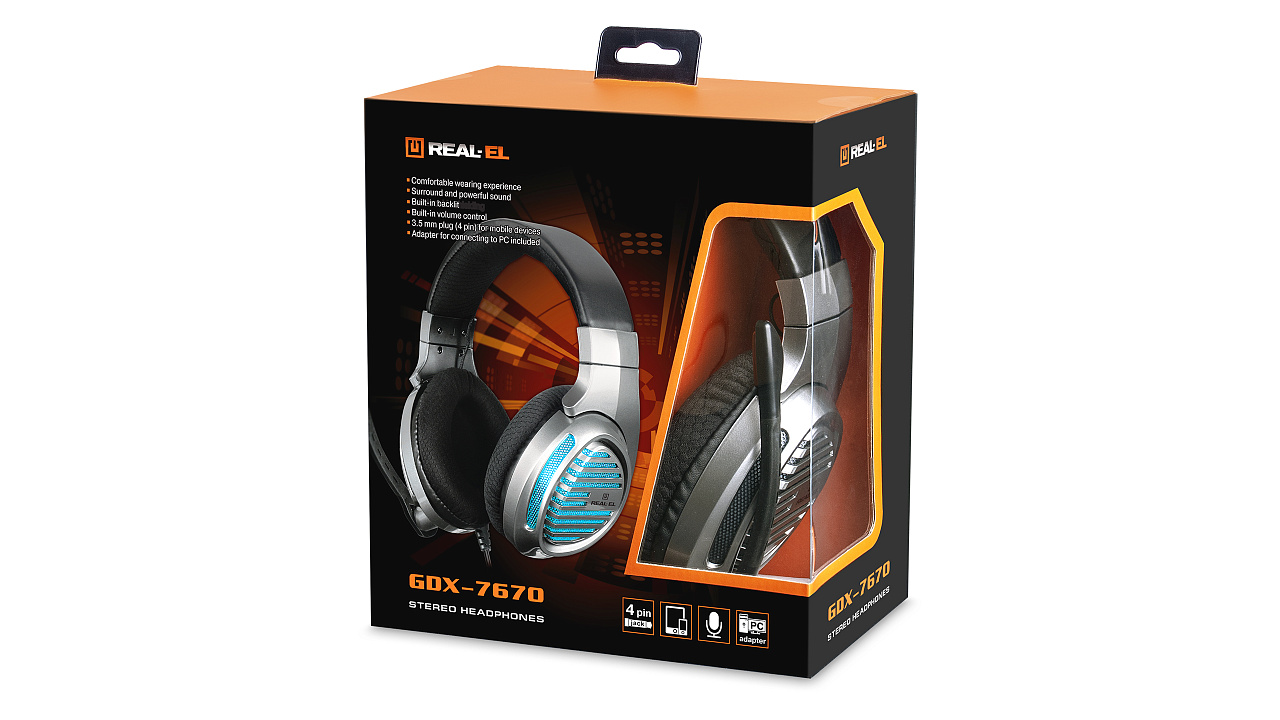 Kõrvaklapid mikrofoniga REAL-EL GDX-7670 saavad olema tõeline kingitus videomängude entusiastidele. Kerge ja vastupidav konstruktsioon, reguleeritav peapael, pehmed kangast kõrvapadjad tagavad mugavuse ja naudingu nii mängimisel kui ka muusika kuulamisel. Juhtme peal on mugav juhtpaneel. Sobib mängimiseks nii arvutis (mini-jack 2*Ø 3,5 mm adapteriga) kui ka mobiilseks mängimiseks (mini-jack Ø 3,5 mm - 4 pin).