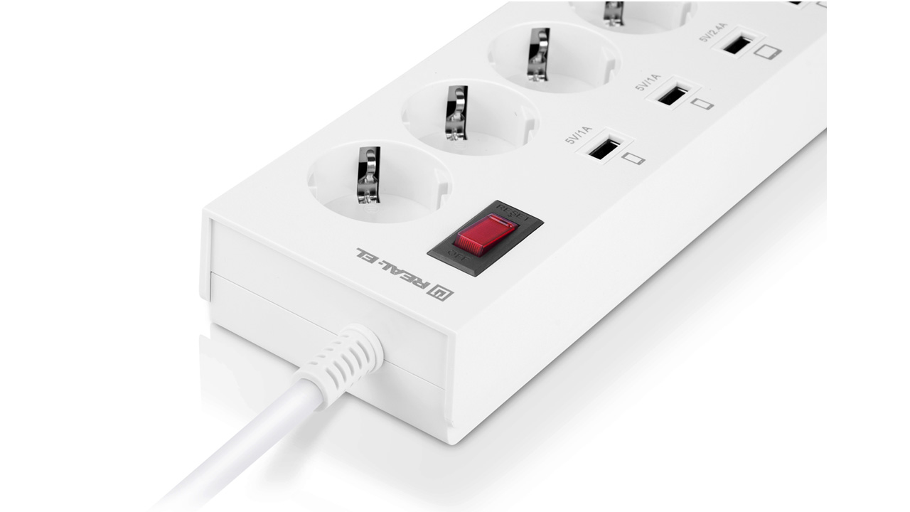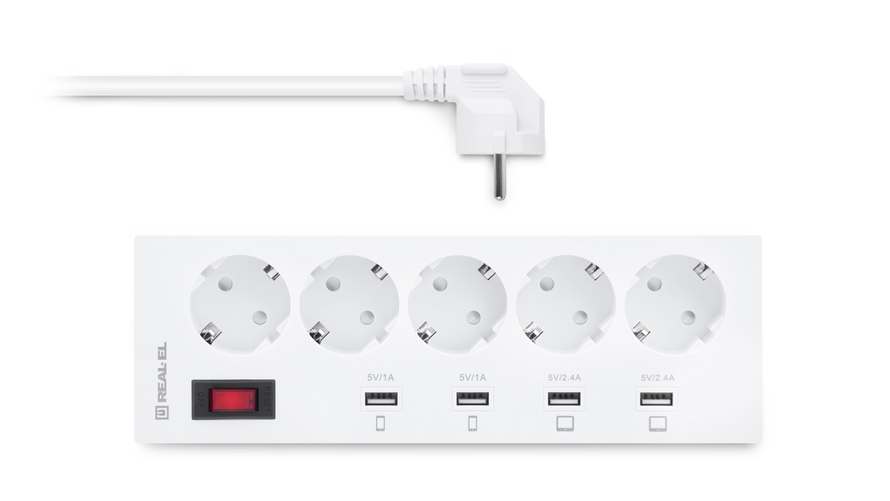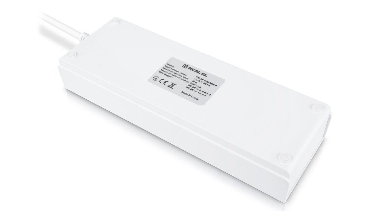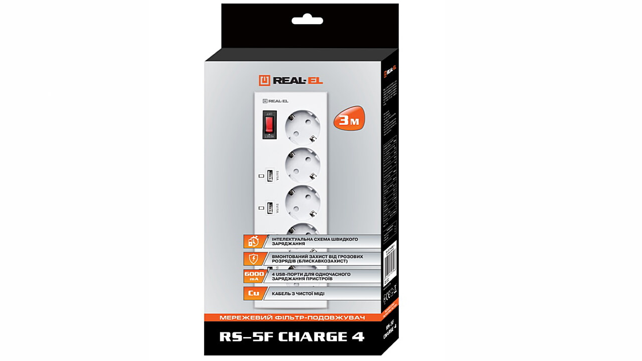 Sellel on neli USB-porti samaaegseks laadimiseks ja see toetab kiirlaadimise tehnoloogiat. Sellisele portide arvule on välja töötatud intelligentne kiirlaadimisskeem, mis muudab REAL-EL RS-5F Charge 4 ideaalseks kaasaegsetele vidinatele ja kiirele elutempole. Filteril on ka viis pistikupesa, millel on igal ühel maandus ja kaitsekatted turvalisuse tagamiseks.