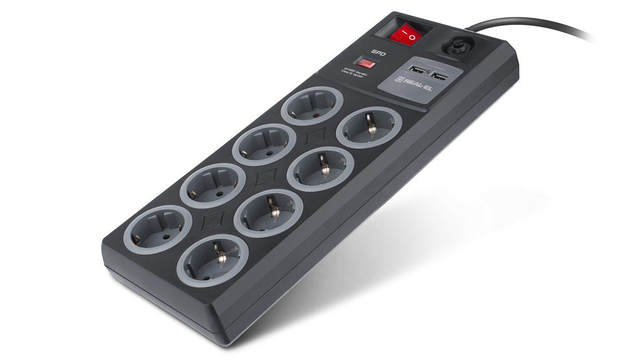 REAL-EL RS-8F USB Charge pikendusjuhe on teie elektroonikaseadmete tõeline kilp, mis sobib ideaalselt kasutamiseks kontorites, suurtes kodudes või korterites. Filtril on sisseehitatud kaitse äikesetõrje vastu. Filtril on taastuv kaitse, mida pole vaja välja vahetada, ja kaabel on valmistatud kõrgekvaliteedilisest puhtast vasest.