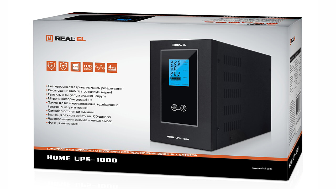 Lineaarne-interaktiivne pideva toimega ja pikaajalise reserveerimisajaga katkematu toite allikas väliste patareide juurdelülitamiseks REAL-EL HOME UPS-1000 on ettenähtud ekspluateerimiseks mittehooldatavate plii-happeliste AGM tüüpi akupatareidega pingega 12V. Nende tööpõhimõte põhineb väliste patareide alalisvoolu muundamises vahelduvvooluks. Voolu kuju väljundil – sümmeetriline sinusoid.