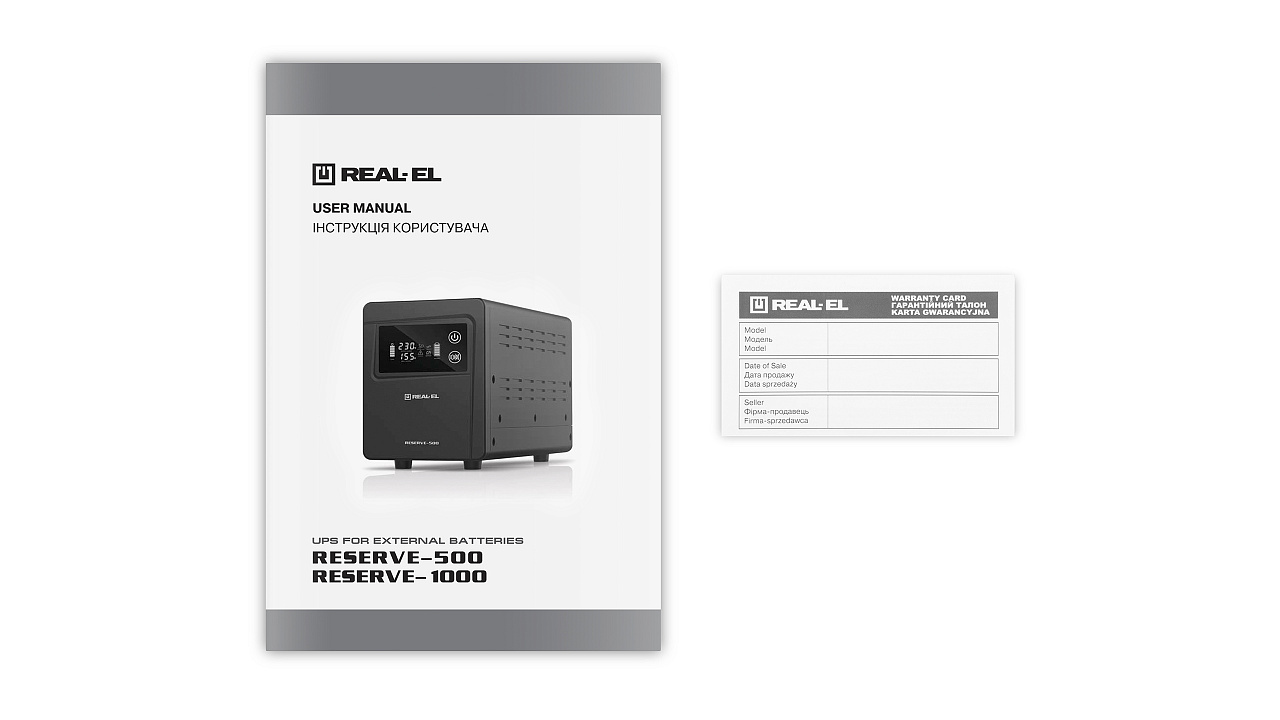 Järjestikune interaktiivne UPS pideva varundamisajaga väliste akude ühendamiseks REAL-EL RESERVE-500 on mõeldud kasutamiseks 12 V pinge ja tüüpi AGM tüüpi hooldusvabade pliiakudega. Nende tööpõhimõte põhineb väliste akude alalisvoolu muundamisel vahelduvvooluks. Väljundvoolu kuju on puhas siinuslaine.